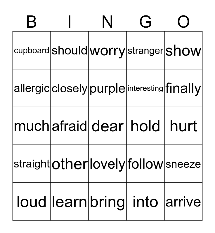 This bingo card has 30 words: learn, hit, afraid, untie, cupboard, worry, closely, lovely, hold, bring, hurt, dear, into, arrive, finally, sand, follow, straight, other, show, much, seem, should, interesting, allergic, stranger, sneeze, loud, purple and better.