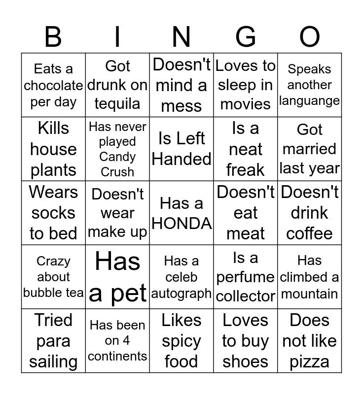 This bingo card has 25 words: Has a pet, Likes spicy food, Is Left Handed, Tried para sailing, Speaks another languange, Eats a chocolate per day, Kills house plants, Got drunk on tequila, Doesn't eat meat, Has a celeb autograph, Is a neat freak, Wears socks to bed, Is a perfume collector, Has climbed a mountain, Has never played Candy Crush, Does not like pizza, Doesn't drink coffee, Doesn't mind a mess, Got married last year, Doesn't wear make up, Has a HONDA, Has been on 4 continents, Crazy about bubble tea, Loves to sleep in movies and Loves to buy shoes.