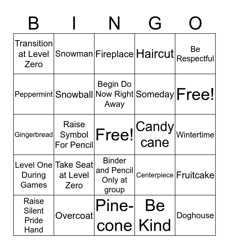 This bingo card has a free space and 24 words: Raise Silent Pride Hand, Take Seat at Level Zero, Begin Do Now Right Away, Be Kind, Be Respectful, Transition at Level Zero, Snowman, Fireplace, Candy cane, Wintertime, Gingerbread, Snowball, Centerpiece, Fruitcake, Peppermint, Overcoat, Pine-cone, Haircut, Free!, Level One During Games, Raise Symbol For Pencil, Binder and Pencil Only at group, Someday and Doghouse.