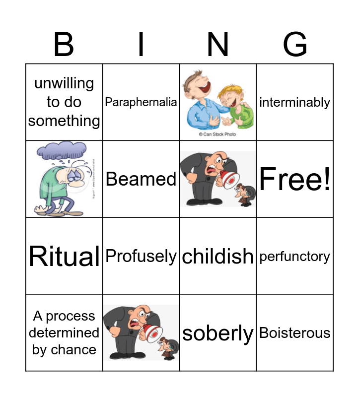This bingo card has 4 images and 14 words: Profusely, Boisterous, unwilling to do something, childish, interminably, A process determined by chance, Paraphernalia, Free!, Ritual, soberly, perfunctory, Beamed, Lapse and paraphernalia.