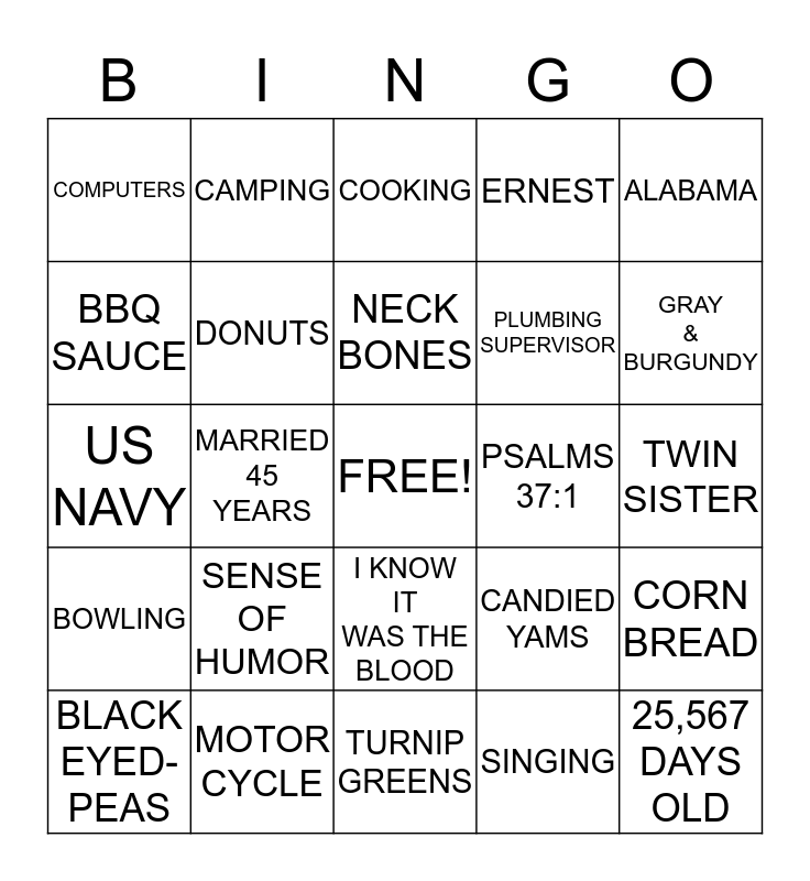 This bingo card has a free space and 24 words: SENSE OF HUMOR, MOTOR CYCLE, NECK BONES, BLACK EYED-PEAS, ALABAMA, COMPUTERS, BBQ SAUCE, CAMPING, PSALMS 37:1, I KNOW IT WAS THE BLOOD, PLUMBING SUPERVISOR, US NAVY, CANDIED YAMS, CORN BREAD, DONUTS, SINGING, TWIN SISTER, COOKING, GRAY & BURGUNDY, MARRIED 45 YEARS, 25,567 DAYS OLD, BOWLING, ERNEST and TURNIP GREENS.