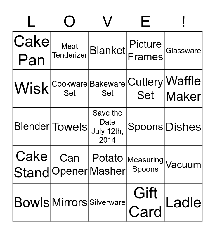 This bingo card has a free space and 24 words: Can Opener, Mirrors, Bakeware Set, Bowls, Glassware, Cake Pan, Wisk, Meat Tenderizer, Spoons, Potato Masher, Cutlery Set, Blender, Measuring Spoons, Vacuum, Cookware Set, Gift Card, Dishes, Blanket, Waffle Maker, Towels, Ladle, Cake Stand, Picture Frames and Silverware.