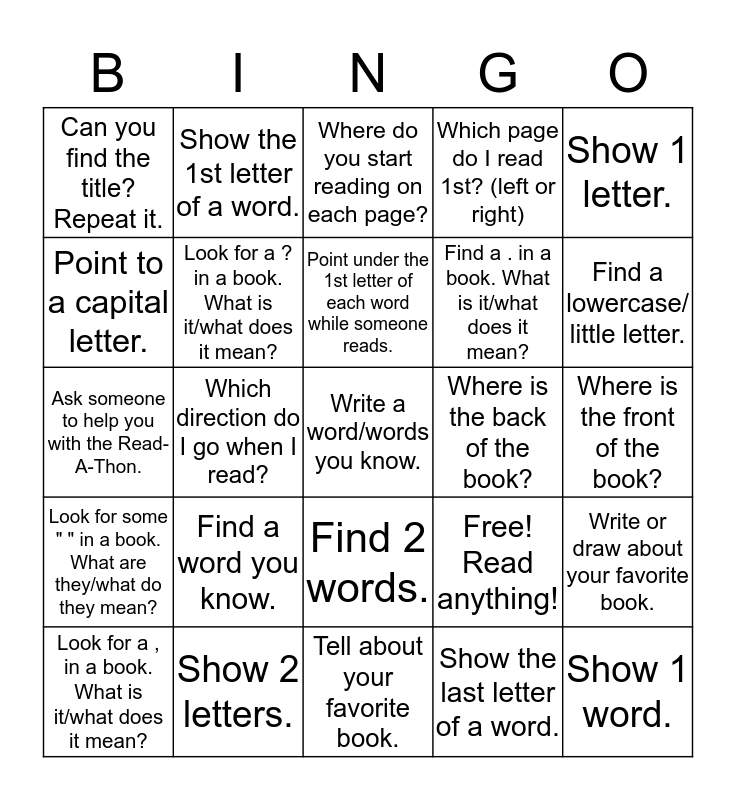 This bingo card has 25 words: Find a word you know., Tell about your favorite book., Point under the 1st letter of each word while someone reads., Look for a , in a book. What is it/what does it mean?, Show 1 letter., Can you find the title? Repeat it., Point to a capital letter., Show the 1st letter of a word., Where is the back of the book?, Find 2 words., Find a . in a book. What is it/what does it mean?, Ask someone to help you with the Read-A-Thon., Free! Read anything!, Write or draw about your favorite book., Look for a ? in a book. What is it/what does it mean?, Show 1 word., Where is the front of the book?, Where do you start reading on each page?, Find a lowercase/ little letter., Which direction do I go when I read?, Write a word/words you know., Show 2 letters., Look for some " " in a book. What are they/what do they mean?, Which page do I read 1st? (left or right) and Show the last letter of a word..