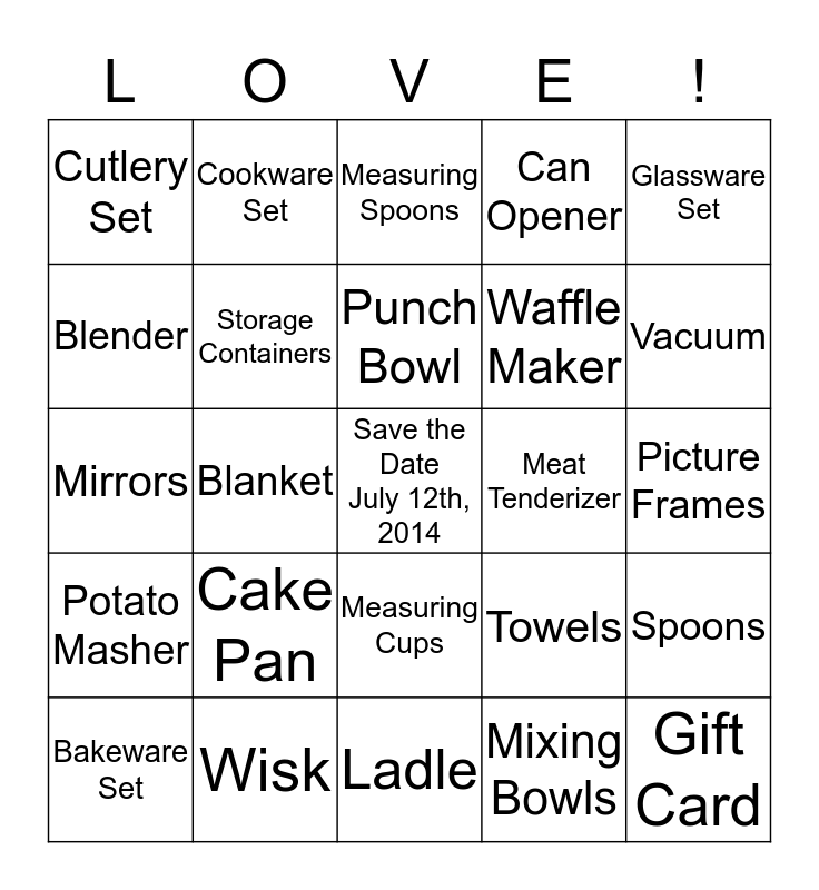This bingo card has a free space and 24 words: Cake Pan, Wisk, Punch Bowl, Bakeware Set, Glassware Set, Cutlery Set, Blender, Cookware Set, Meat Tenderizer, Measuring Cups, Waffle Maker, Mirrors, Towels, Spoons, Storage Containers, Mixing Bowls, Picture Frames, Measuring Spoons, Vacuum, Blanket, Gift Card, Potato Masher, Can Opener and Ladle.