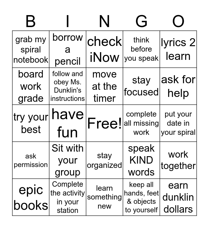 This bingo card has a free space and 24 words: Sit with your group, Complete the activity in your station, move at the timer, epic books, lyrics 2 learn, grab my spiral notebook, board work grade, borrow a pencil, complete all missing work, stay organized, stay focused, try your best, speak KIND words, work together, follow and obey Ms. Dunklin's instructions, keep all hands, feet & objects to yourself, put your date in your spiral, check iNow, ask for help, have fun, earn dunklin dollars, ask permission, think before you speak and learn something new.
