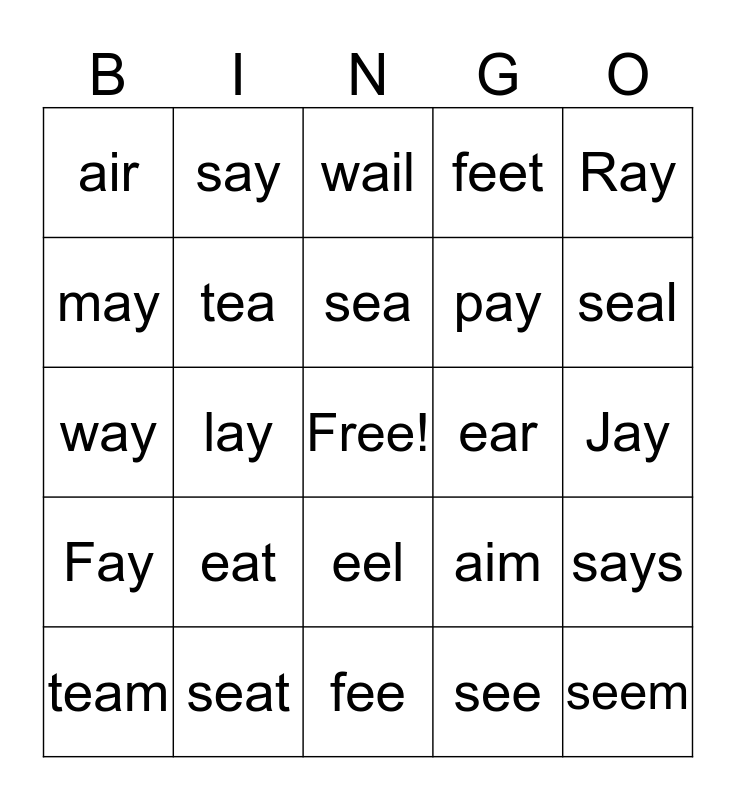 This bingo card has a free space and 24 words: eat, seat, sea, team, Ray, air, may, say, ear, eel, pay, way, aim, says, tea, see, Jay, wail, seal, lay, seem, Fay, feet and fee.