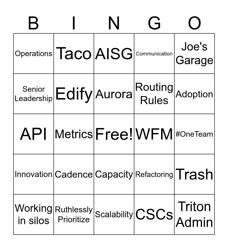 This bingo card has a free space and 40 words: Sprint Goals, API, Field Claims, Edify, Ruthlessly Prioritize, Capacity, Aurora, GRS, Joe's Garage, Innovation, Metrics, Communication, Triton Admin, #OneTeam, WFM, Cadence, BL vs. PL, Operations, Dynamo, AISG, Trash, CSCs, Routing Rules, Senior Leadership, Stability, Security Review, Hand-offs, Does that make sense?, Task Router, Kickin' the tires, Future-proof, Working in silos, Low hanging fruit, Refactoring, Adoption, Scalability, Prod Monitoring, KPIs, Taco and Move the needle.