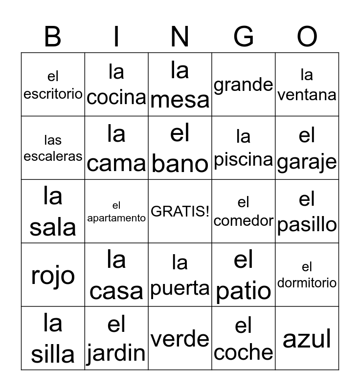 This bingo card has a free space and 24 words: la casa, el jardin, el bano, la silla, la ventana, el escritorio, las escaleras, la cocina, el comedor, la puerta, la piscina, la sala, el patio, el dormitorio, la cama, el coche, el pasillo, la mesa, el garaje, el apartamento, azul, rojo, grande and verde.
