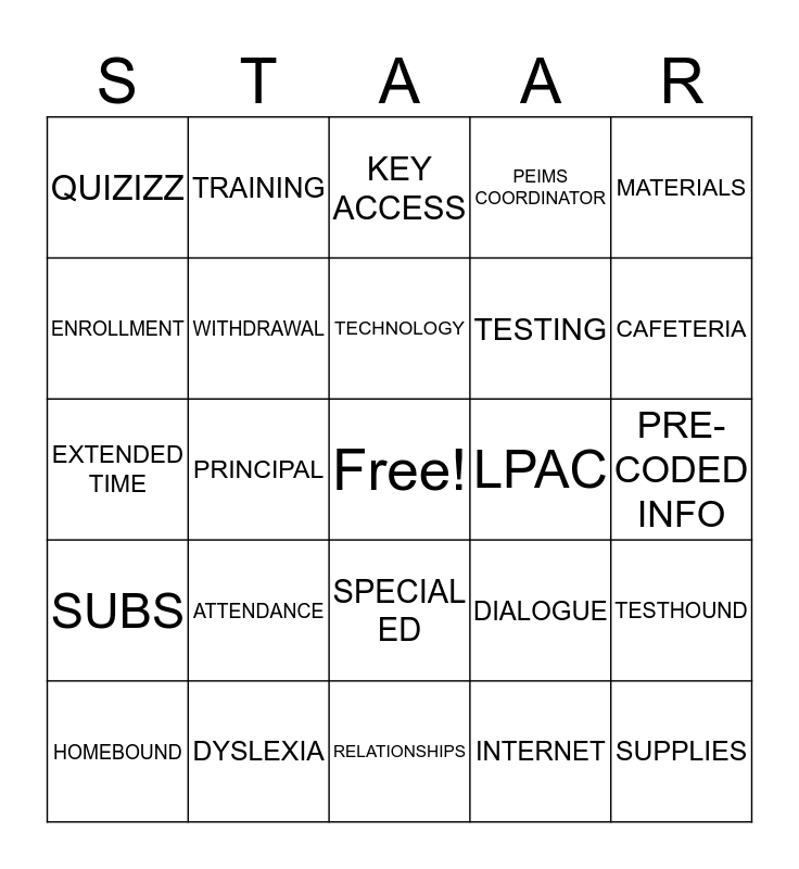This bingo card has a free space and 41 words: CAMPUS PLAN, ATTENDANCE, ACCOUNTABILITY, TESTING, SUPPLIES, SUBS, PRINCIPAL, PRINCIPAL SECRETARY, PEIMS COORDINATOR, PRE-CODED INFO, ENROLLMENT, WITHDRAWAL, TECHNOLOGY, INTERNET, CAFETERIA, EXTENDED TIME, MAINTENANCE, KEY ACCESS, CUSTODIAN, MATERIALS, HOMEBOUND, MAKE-UP POLICY, SPECIAL ED, LPAC, RTI, 504, DYSLEXIA, ACCESSIBILITY, DIALOGUE, IRREGULARITIES, STAKEHOLDERS, TRAINING, RELATIONSHIPS, TSNAP, TESTHOUND, QUIZIZZ, KAHOOT, CHOCOLATE, FLEXIBLE, DCCR and COLLABORATE.