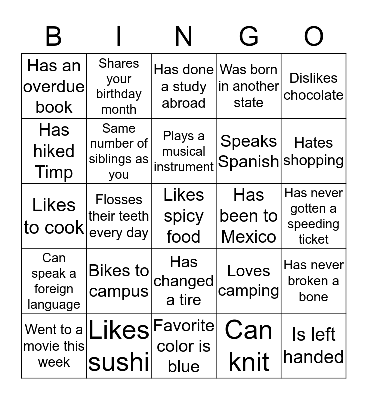 This bingo card has a free space and 24 words: Bikes to campus, Likes sushi, Plays a musical instrument, Went to a movie this week, Dislikes chocolate, Has an overdue book, Has hiked Timp, Shares your birthday month, Has been to Mexico, Has changed a tire, Speaks Spanish, Likes to cook, Loves camping, Has never broken a bone, Same number of siblings as you, Can knit, Has never gotten a speeding ticket, Has done a study abroad, Hates shopping, Flosses their teeth every day, Is left handed, Can speak a foreign language, Was born in another state and Favorite color is blue.