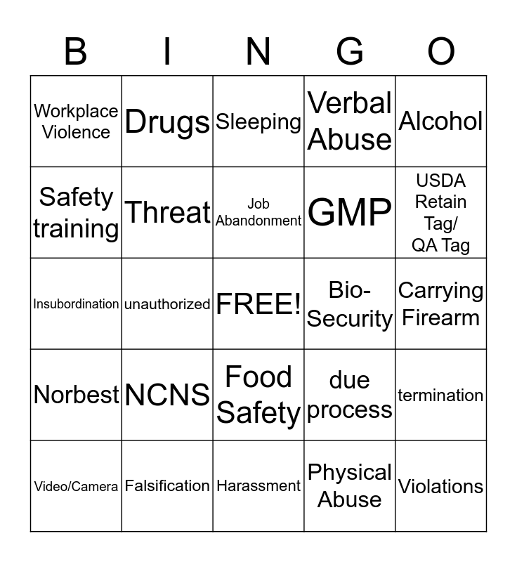 This bingo card has a free space and 25 words: NCNS, Harassment, Job Abandonment, Video/Camera, Alcohol, Workplace Violence, Safety training, Drugs, Bio-Security, Food Safety, GMP, Insubordination, due process, termination, Threat, Theft, Carrying Firearm, Sleeping, USDA Retain Tag/ QA Tag, unauthorized, Violations, Falsification, Norbest, Verbal Abuse and Physical Abuse.