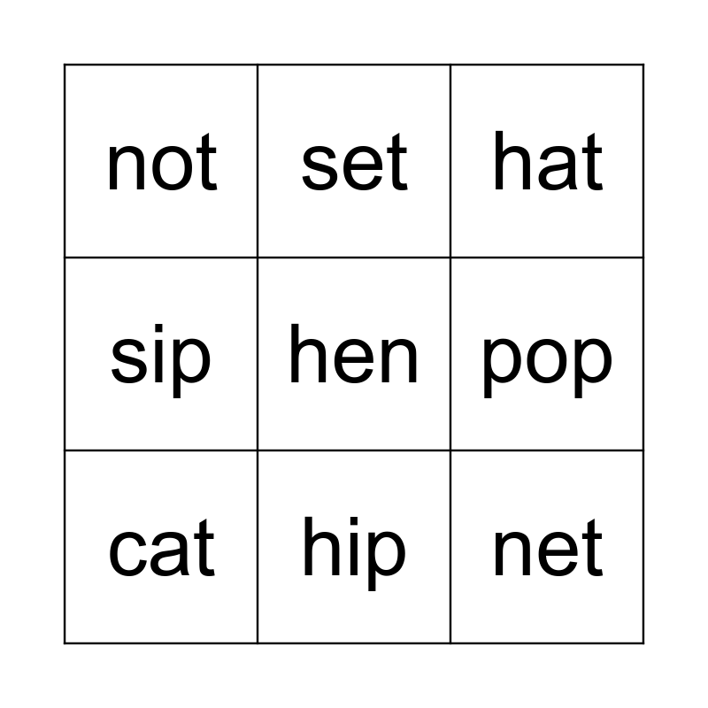 This bingo card has 18 words: pet, dim, hat, not, tan, sip, pot, set, hip, net, tap, hen, map, pop, cat, sit, ten and hot.