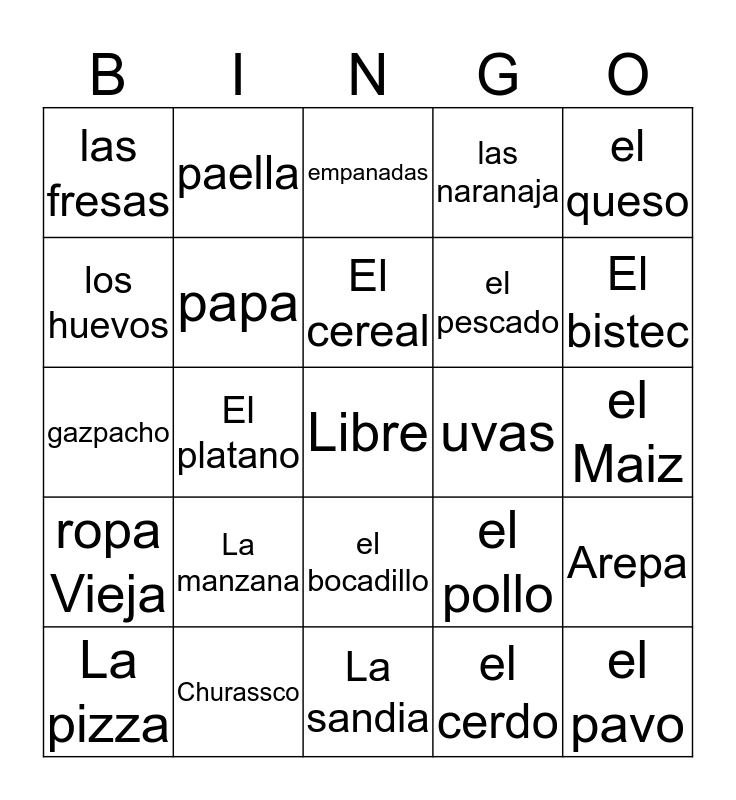 This bingo card has a free space and 24 words: La manzana, Churassco, El cereal, La pizza, el queso, las fresas, los huevos, paella, uvas, el bocadillo, el pescado, gazpacho, el pollo, Arepa, papa, el cerdo, el Maiz, empanadas, El bistec, El platano, el pavo, ropa Vieja, las naranaja and La sandia.