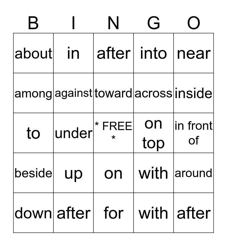 This bingo card has a free space and 24 words: up, after, toward, down, near, about, among, in, on top, on, across, to, with, around, against, with, in front of, after, inside, under, after, beside, into and for.