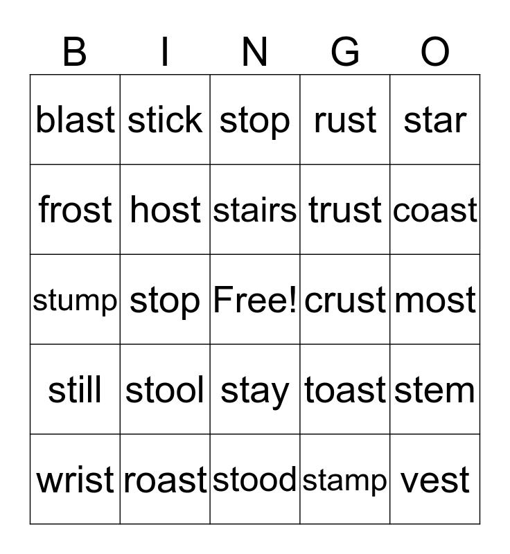 This bingo card has a free space and 24 words: stool, roast, stairs, wrist, star, blast, frost, stick, crust, stay, trust, stump, toast, stem, host, stamp, most, stop, coast, stop, vest, still, rust and stood.