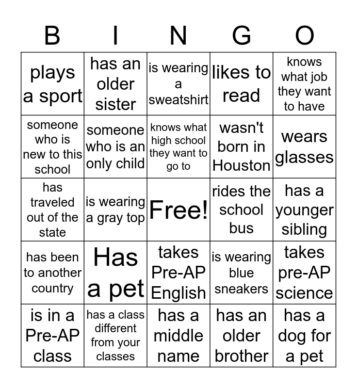 This bingo card has a free space and 24 words: Has a pet, has a class different from your classes, knows what high school they want to go to, is in a Pre-AP class, knows what job they want to have, plays a sport, someone who is new to this school, has an older sister, rides the school bus, takes Pre-AP English, wasn't born in Houston, has traveled out of the state, is wearing blue sneakers, takes pre-AP science, someone who is an only child, has an older brother, has a younger sibling, is wearing a sweatshirt, wears glasses, is wearing a gray top, has a dog for a pet, has been to another country, likes to read and has a middle name.