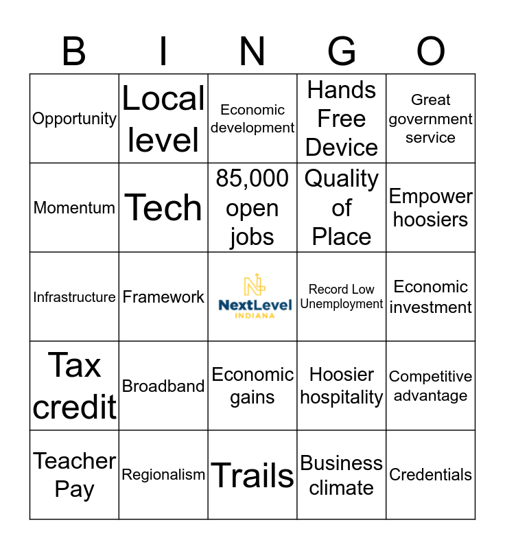 This bingo card has a free space and 42 words: 21st Century workforce, 85,000 open jobs, Balanced budget, Broadband, Business climate, Competitive advantage, Credentials, Diverse, Economic development, Economic gains, Economic investment, Empower hoosiers, Framework, Great government service, High speed internet, Hoosier hospitality, Indiana leads the way, Infrastructure, Innovation and entrepreneurship, Local level, Momentum, Most vulnerable, Opioid epidemic, Opportunity, Pipeline, Postsecondary education, Quality of Place, Regulatory climate, Return on Investment, STEM, Strategic investments, Tax credit, Tech, Trails, Veterans, Teacher Pay, Regionalism, Record Low Unemployment, Airport, Revenue, Hands Free Device and Medical Bills.