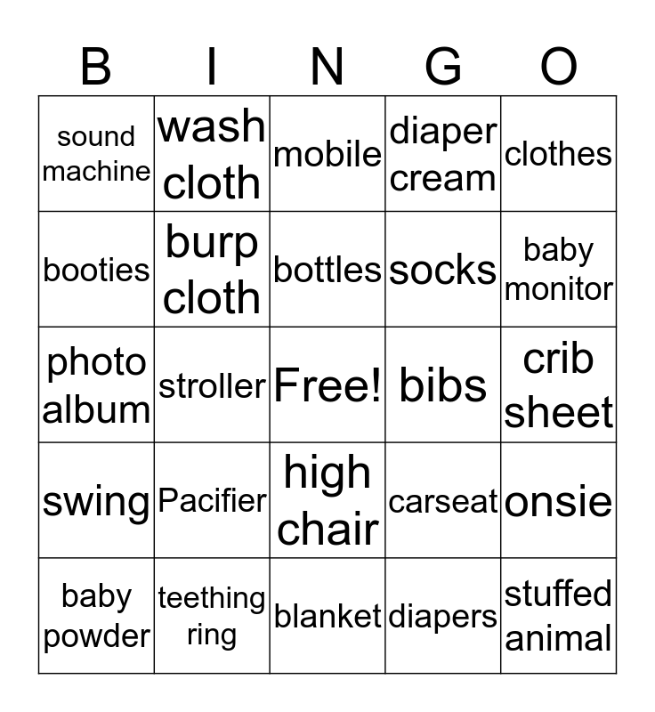 This bingo card has a free space and 24 words: Pacifier, teething ring, bottles, baby powder, clothes, sound machine, booties, wash cloth, bibs, high chair, socks, photo album, carseat, onsie, burp cloth, diapers, crib sheet, mobile, baby monitor, stroller, stuffed animal, swing, diaper cream and blanket.