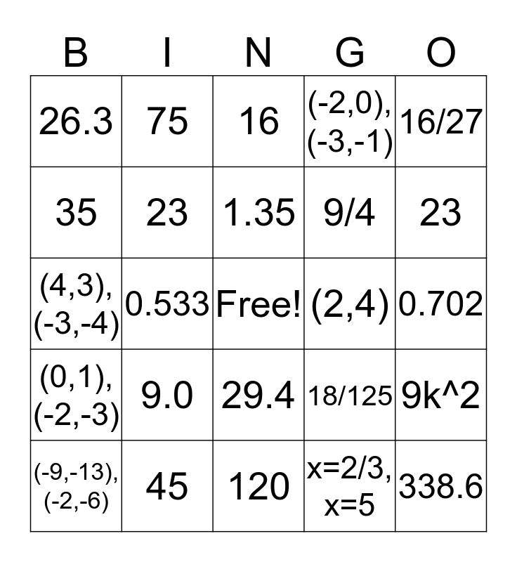This bingo card has a free space and 28 words: 9k^2, 81/4, 9/4, x=2/3, x=5, 35, 16, 75, (0,1), (-2,-3), (2,4), (-9,-13),(-2,-6), (4,3),(-3,-4), (-2,0),(-3,-1), 45, 120, 23, 38, 9.0, 23, 1.35, 29.4, 26.3, 55, 338.6, 0.533, 0.702, 18/125, 16/27 and 3/11.