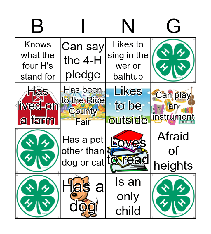 This bingo card has 10 images and 12 words: Has a dog, Likes to sing in the wer or bathtub, Has lived on a farm, Can say the 4-H pledge, Loves to read, Afraid of heights, Knows what the four H's stand for, Has been to the Rice County Fair, Is an only child, Can play an instrument, Has a pet other than dog or cat and Likes to be outside.
