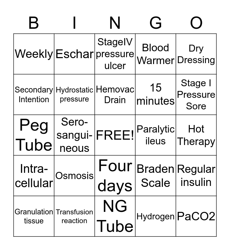 This bingo card has a free space and 24 words: Osmosis, Transfusion reaction, Hemovac Drain, Granulation tissue, Dry Dressing, Weekly, Secondary Intention, Eschar, Paralytic ileus, Four days, 15 minutes, Peg Tube, Braden Scale, Regular insulin, Hydrostatic pressure, Hydrogen, Hot Therapy, StageIV pressure ulcer, Stage I Pressure Sore, Sero- sangui- neous, PaCO2, Intra- cellular, Blood Warmer and NG Tube.