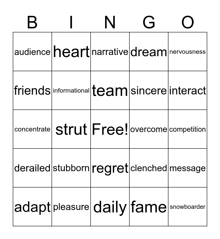 This bingo card has a free space and 29 words: adapt, accustomed, strut, hustle, audience, narrative, informational, stubborn, overcome, pleasure, competition, snowboarder, daily, fame, interact, attempt, regret, derailed, nervousness, concentrate, clenched, grace, sincere, friends, dream, heart, message, team and tryouts.