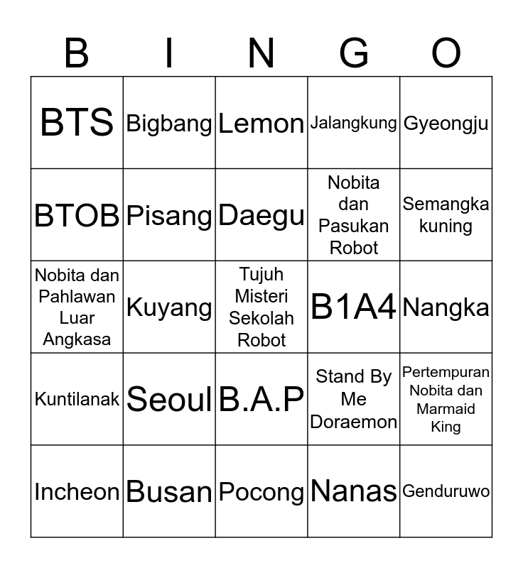 This bingo card has a free space and 24 words: Seoul, Busan, Daegu, Incheon, Gyeongju, BTS, BTOB, Bigbang, B1A4, B.A.P, Nobita dan Pasukan Robot, Nobita dan Pahlawan Luar Angkasa, Stand By Me Doraemon, Pertempuran Nobita dan Marmaid King, Pisang, Nanas, Nangka, Lemon, Semangka kuning, Kuyang, Genduruwo, Kuntilanak, Jalangkung and Pocong.