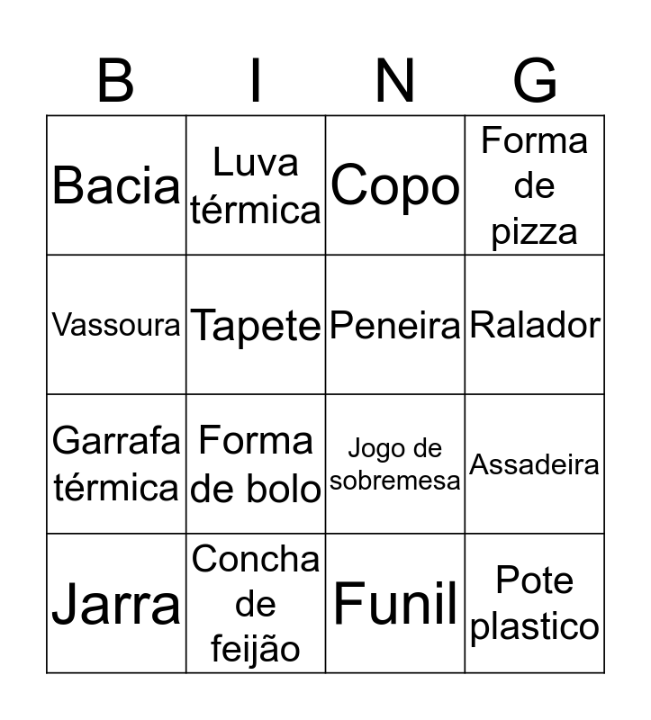 This bingo card has 36 words: Free!, Colher de pau, Jogo de talher, Peneira, Tábua de carne, Pote plastico, Ralador, Rodo, Vassoura, Balde, Assadeira, Forma de pizza, Pano de prato, Concha de feijão, Forma de bolo, Bacia, Leiteira, Panela de pressão, Jarra, Copo, Funil, Escorredor de massa, Travessa, Porta tempero, Avental, Luva térmica, Jogo de sobremesa, Garrafa de água, Garrafa térmica, Tapete, Lixo de pia, Lixo de banheiro, Rodinho de pia, Frigideira, Panela and Açucareiro.