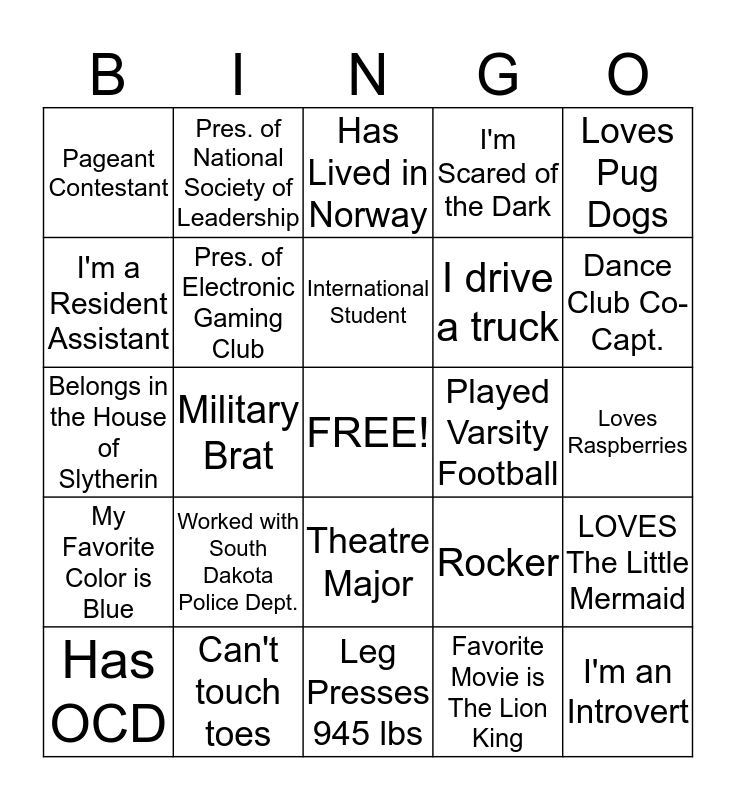 This bingo card has a free space and 24 words: Worked with South Dakota Police Dept., Can't touch toes, International Student, Has OCD, Loves Pug Dogs, Pageant Contestant, I'm a Resident Assistant, Pres. of National Society of Leadership, Played Varsity Football, Theatre Major, I drive a truck, Belongs in the House of Slytherin, Rocker, LOVES The Little Mermaid, Pres. of Electronic Gaming Club, Favorite Movie is The Lion King, Loves Raspberries, Has Lived in Norway, Dance Club Co-Capt., Military Brat, I'm an Introvert, My Favorite Color is Blue, I'm Scared of the Dark and Leg Presses 945 lbs.