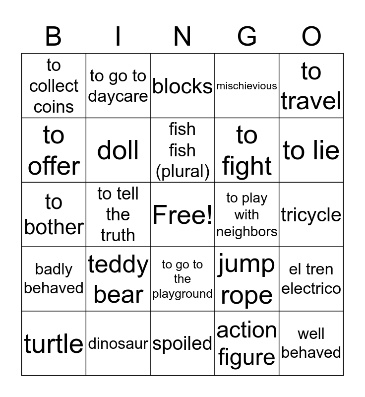 This bingo card has a free space and 24 words: teddy bear, dinosaur, fish fish (plural), turtle, to travel, to collect coins, to offer, to go to daycare, to play with neighbors, to go to the playground, to fight, to bother, jump rope, el tren electrico, doll, action figure, tricycle, blocks, to lie, to tell the truth, well behaved, badly behaved, mischievious and spoiled.