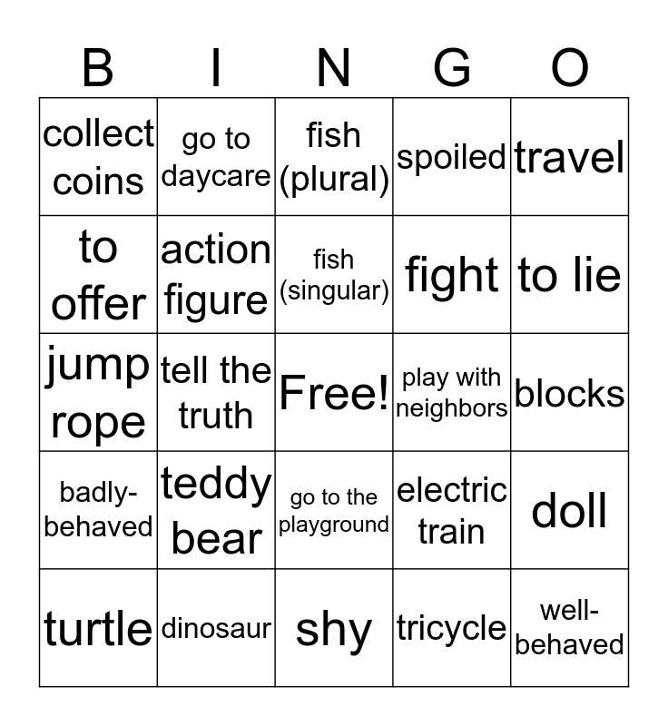 This bingo card has a free space and 24 words: teddy bear, dinosaur, fish (singular), turtle, travel, collect coins, to offer, go to daycare, play with neighbors, go to the playground, fight, jump rope, electric train, doll, action figure, tricycle, blocks, fish (plural), to lie, tell the truth, well-behaved, badly-behaved, spoiled and shy.