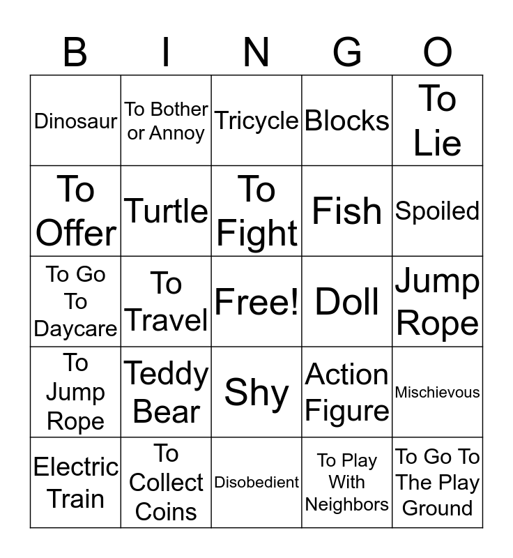 This bingo card has a free space and 24 words: Teddy Bear, To Collect Coins, To Fight, Electric Train, To Lie, Dinosaur, To Offer, To Bother or Annoy, Doll, Shy, Fish, To Go To Daycare, Action Figure, Mischievous, Turtle, To Play With Neighbors, Jump Rope, Tricycle, Spoiled, To Travel, To Go To The Play Ground, To Jump Rope, Blocks and Disobedient.