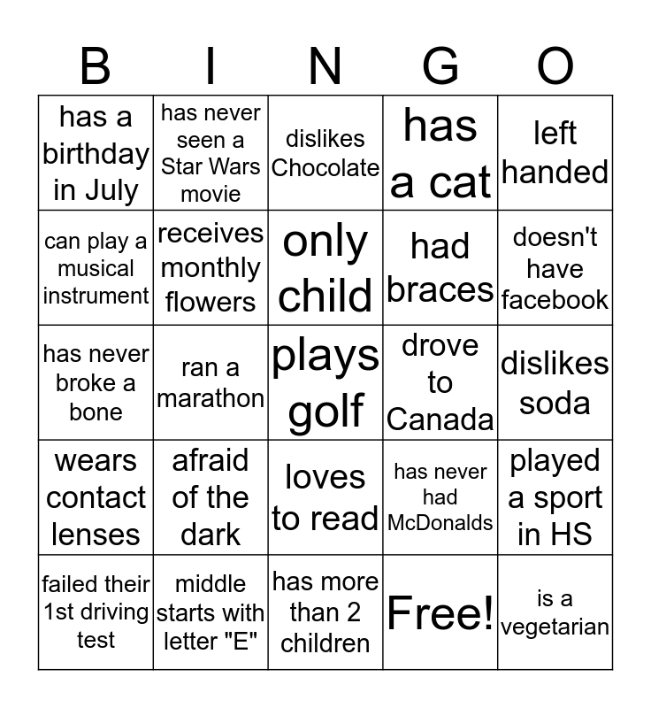 This bingo card has 30 words: middle starts with letter "E", never swears, ran a marathon, has never got a speeding ticket, has a birthday in July, dislikes Chocolate, receives monthly flowers, loves to read, drove to Canada, has more than 2 children, dislikes soda, plays golf, Free!, is a vegetarian, doesn't have facebook, allergic to nuts, has never had McDonalds, wears contact lenses, afraid of the dark, left handed, has never broke a bone, watches reality tv, has never seen a Star Wars movie, had braces, can play a musical instrument, has a cat, played a sport in HS, failed their 1st driving test, only child and never had a cavity.