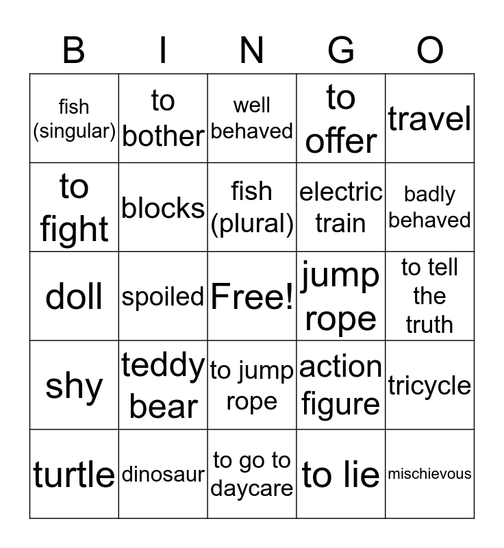 This bingo card has a free space and 24 words: teddy bear, dinosaur, fish (plural), turtle, travel, fish (singular), to fight, to bother, jump rope, to jump rope, electric train, doll, action figure, tricycle, blocks, to lie, to tell the truth, well behaved, badly behaved, spoiled, mischievous, shy, to offer and to go to daycare.
