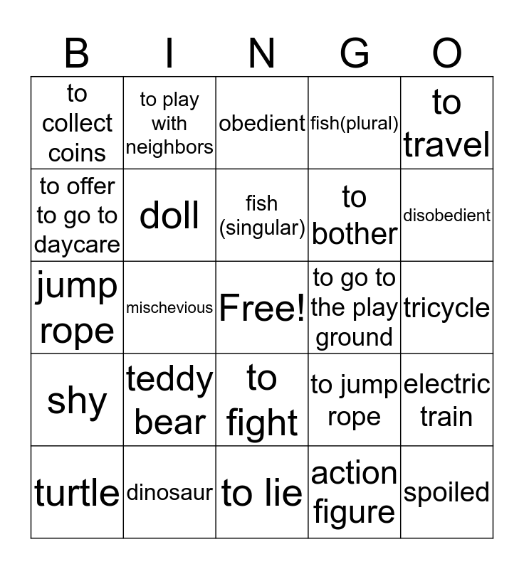 This bingo card has a free space and 24 words: teddy bear, dinosaur, fish (singular), turtle, to travel, to collect coins, to offer to go to daycare, to play with neighbors, to go to the play ground, to fight, to bother, jump rope, to jump rope, electric train, doll, action figure, tricycle, obedient, disobedient, mischevious, spoiled, shy, fish(plural) and to lie.