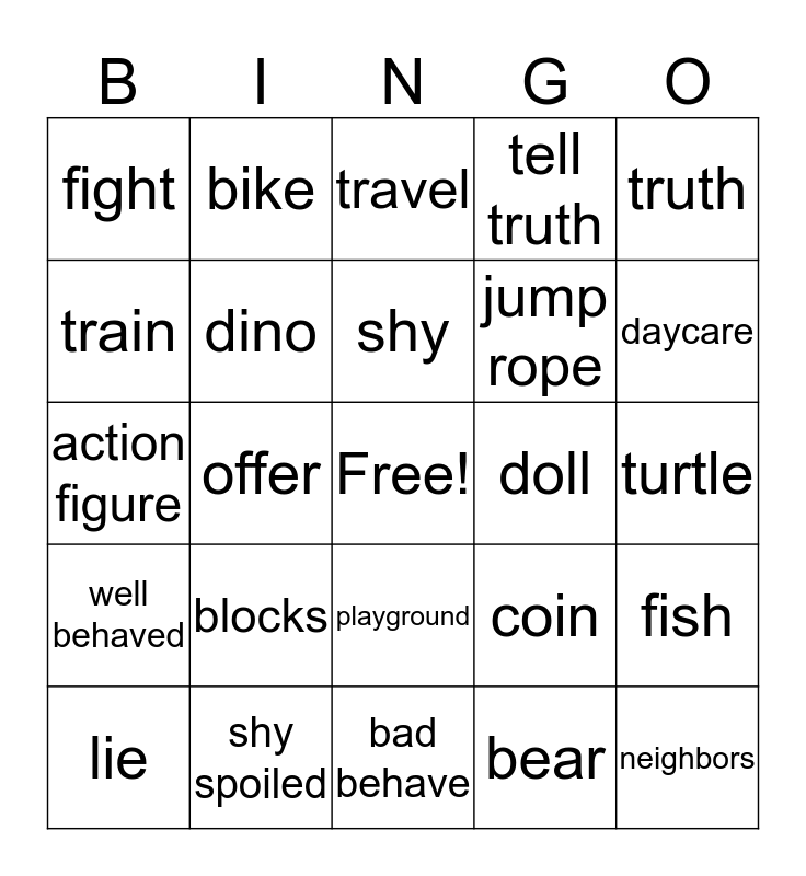 This bingo card has a free space and 24 words: blocks, shy spoiled, shy, lie, truth, fight, train, bike, doll, playground, jump rope, action figure, coin, fish, dino, bear, turtle, travel, daycare, offer, neighbors, well behaved, tell truth and bad behave.