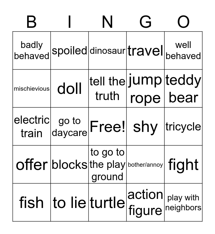 This bingo card has a free space and 24 words: blocks, to lie, tell the truth, fish, well behaved, badly behaved, mischievious, spoiled, shy, to go to the play ground, jump rope, electric train, bother/annoy, fight, doll, action figure, tricycle, dinosaur, teddy bear, go to daycare, play with neighbors, offer, travel and turtle.