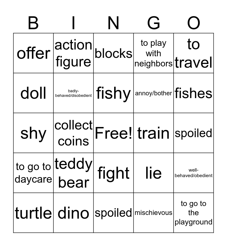 This bingo card has a free space and 24 words: teddy bear, dino, fishy, turtle, to travel, offer, doll, action figure, train, fight, annoy/bother, shy, lie, well-behaved/obedient, badly-behaved/disobedient, mischievous, spoiled, blocks, fishes, collect coins, to go to the playground, to go to daycare, to play with neighbors and spoiled.