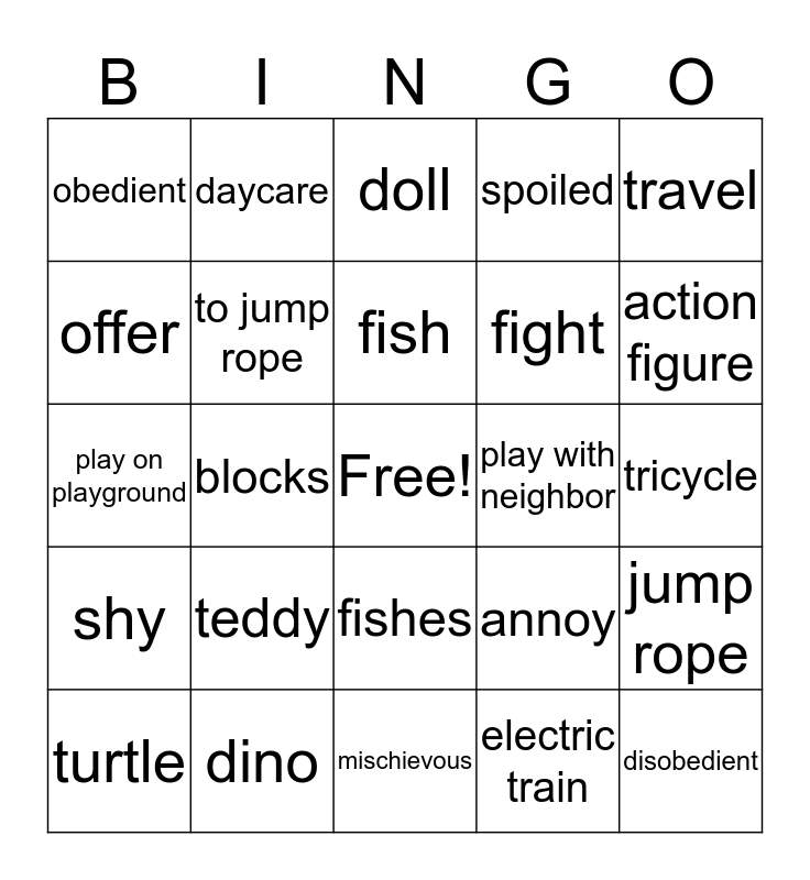 This bingo card has a free space and 24 words: teddy, dino, fish, turtle, travel, obedient, offer, daycare, play with neighbor, fishes, fight, play on playground, annoy, jump rope, to jump rope, electric train, tricycle, doll, action figure, blocks, disobedient, shy, spoiled and mischievous.