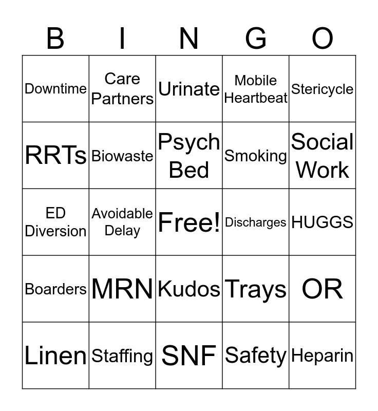This bingo card has a free space and 24 words: MRN, Staffing, Psych Bed, Linen, Stericycle, Downtime, RRTs, Care Partners, Discharges, Kudos, Smoking, ED Diversion, Trays, OR, Biowaste, Safety, HUGGS, Urinate, Social Work, Avoidable Delay, Heparin, Boarders, Mobile Heartbeat and SNF.