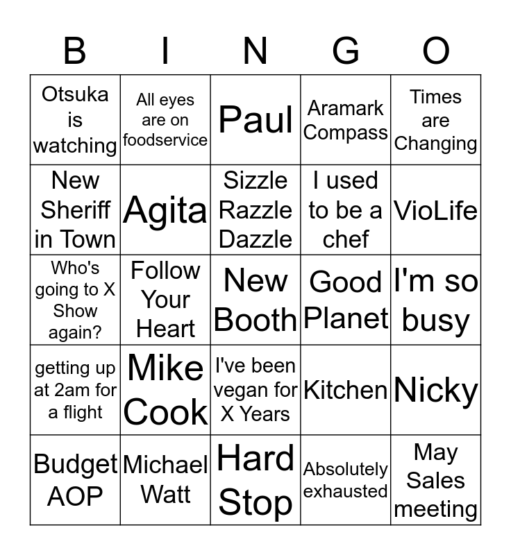 This bingo card has a free space and 24 words: Mike Cook, Michael Watt, Sizzle Razzle Dazzle, Budget AOP, Times are Changing, Otsuka is watching, New Sheriff in Town, All eyes are on foodservice, Good Planet, I've been vegan for X Years, I used to be a chef, Who's going to X Show again?, Kitchen, Nicky, Agita, Absolutely exhausted, I'm so busy, Paul, VioLife, Follow Your Heart, May Sales meeting, getting up at 2am for a flight, Aramark Compass and Hard Stop.