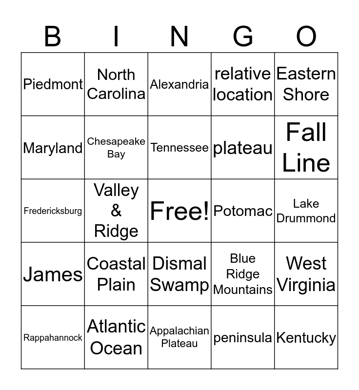 This bingo card has a free space and 25 words: Coastal Plain, Appalachian Plateau, Tennessee, Rappahannock, Eastern Shore, Piedmont, Maryland, North Carolina, Potomac, Dismal Swamp, plateau, Fredericksburg, Blue Ridge Mountains, West Virginia, Chesapeake Bay, York, Lake Drummond, Alexandria, Fall Line, Valley & Ridge, Kentucky, Atlantic Ocean, James, relative location and peninsula.