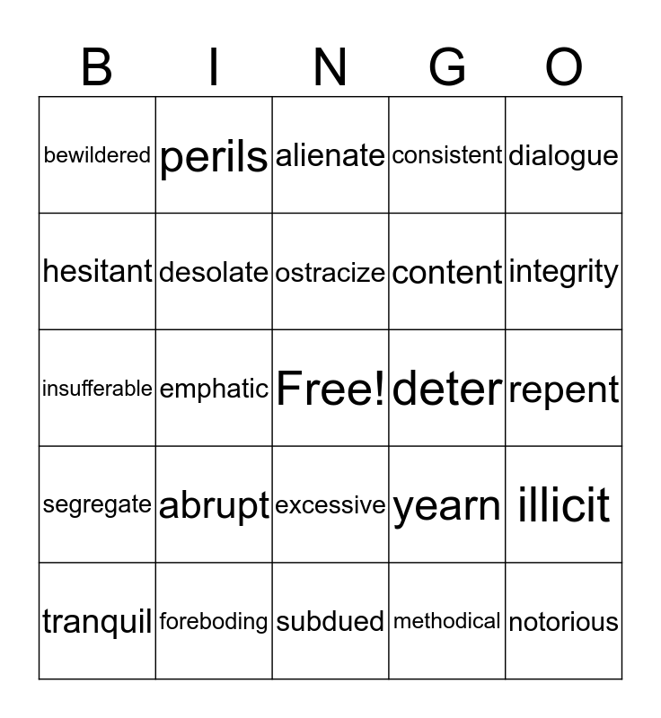 This bingo card has a free space and 24 words: abrupt, foreboding, ostracize, tranquil, dialogue, bewildered, hesitant, perils, deter, excessive, content, insufferable, yearn, illicit, desolate, methodical, repent, alienate, integrity, emphatic, notorious, segregate, consistent and subdued.