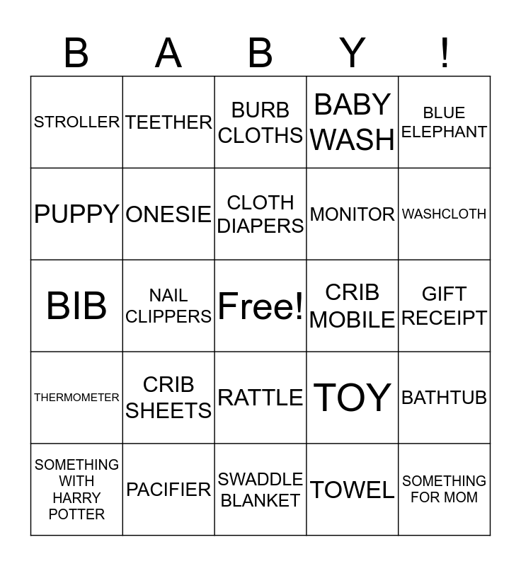 This bingo card has a free space and 40 words: BOTTLE, BIB, RUBBER DUCK, ONESIE, PACIFIER, RATTLE, CLOTH DIAPERS, SOCKS, BLUE ELEPHANT, THERMOMETER, NAIL CLIPPERS, BABY WASH, SOMETHING FOR MOM, GIFT RECEIPT, CRIB MOBILE, CRIB SHEETS, DIAPER BAG, STROLLER, DINOSAURS, BURB CLOTHS, BATHTUB, TOWEL, MONITOR, PUPPY, GIRAFFE, CLOUDS, PAJAMAS, SOMETHING WITH HARRY POTTER, SOMETHING WITH HARRY POTTER, SOMETHING WITH HARRY POTTER, SOMETHING WITH HARRY POTTER, SOMETHING WITH HARRY POTTER, BLANKET, TOY, WASHCLOTH, SWADDLE BLANKET, BABY HAT, STORAGE, TEETHER and BABY LOTION.
