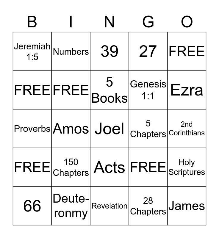 This bingo card has a free space and 24 words: 150 Chapters, Deute- ronmy, 5 Books, 66, FREE, Jeremiah 1:5, FREE, Numbers, 5 Chapters, Acts, Genesis 1:1, Proverbs, FREE, Holy Scriptures, FREE, 28 Chapters, 2nd Corinthians, 39, Ezra, Amos, James, FREE, 27 and Revelation.