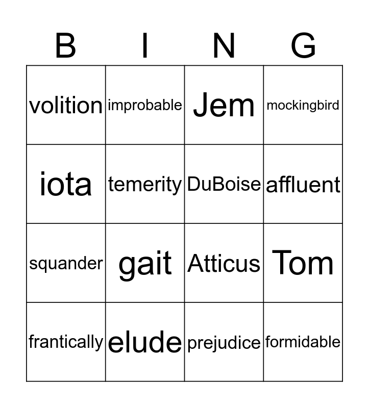 This bingo card has 23 words: formidable, elucidate, affluent, exodus, iota, volition, temerity, improbable, frantically, cease, gait, squander, dismay, flounder, elude, Scout, Jem, Atticus, DuBoise, Tom, mockingbird, prejudice and shoes.