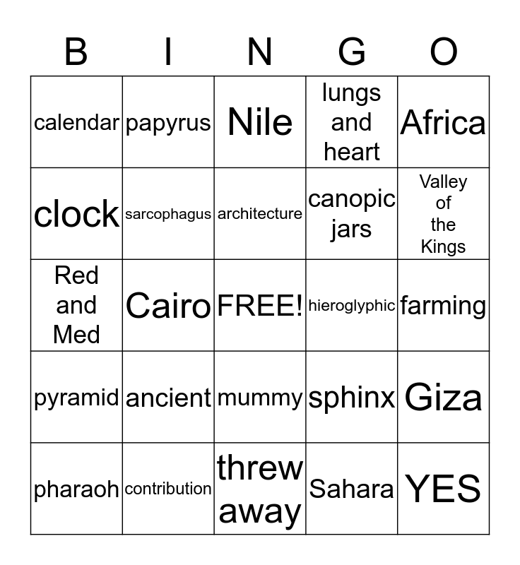 This bingo card has a free space and 24 words: ancient, contribution, architecture, pharaoh, Africa, calendar, clock, papyrus, hieroglyphic, mummy, canopic jars, Red and Med, sphinx, Giza, sarcophagus, Sahara, farming, Nile, Valley of the Kings, Cairo, YES, pyramid, lungs and heart and threw away.