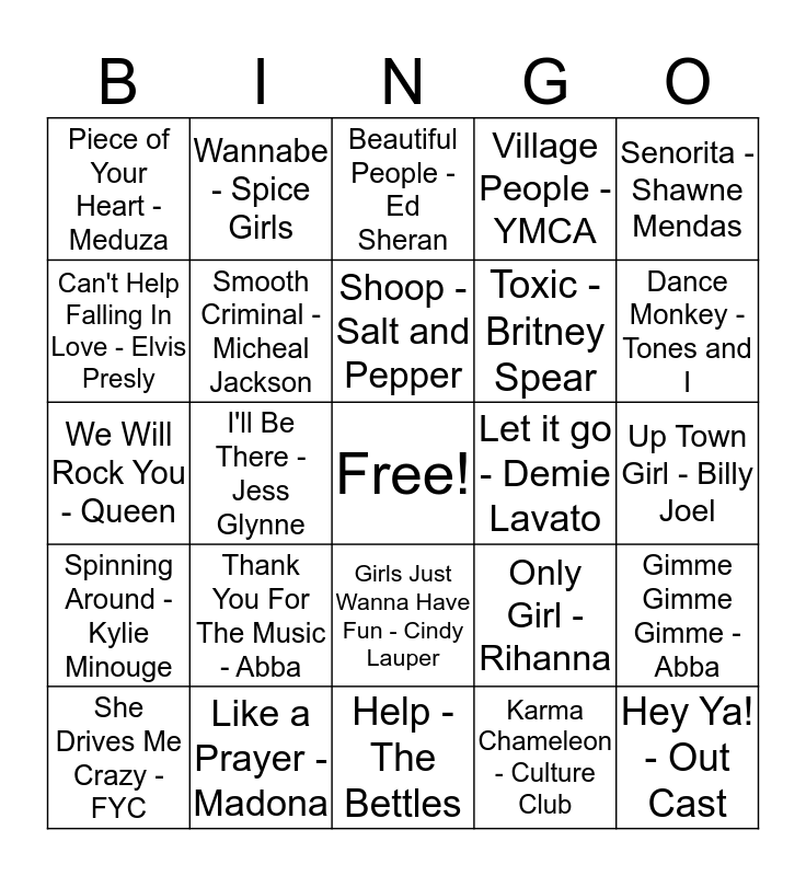 This bingo card has a free space and 28 words: Gimme Gimme Gimme - Abba, I will survive - Gloria Gaynor, Toxic - Britney Spear, Karma Chameleon - Culture Club, Can't Help Falling In Love - Elvis Presly, Beautiful People - Ed Sheran, Wannabe - Spice Girls, Spinning Around - Kylie Minouge, Let it go - Demie Lavato, She Drives Me Crazy - FYC, We Will Rock You - Queen, Village People - YMCA, Like a Prayer - Madona, Help - The Bettles, Dance Monkey - Tones and I, Black Velvet - Alana Miles, Thank You For The Music - Abba, Smooth Criminal - Micheal Jackson, Shoop - Salt and Pepper, Girls Just Wanna Have Fun - Cindy Lauper, Piece of Your Heart - Meduza, Men At Work - Down Under, Hey Ya! - Out Cast, I'll Be There - Jess Glynne, Up Town Girl - Billy Joel, Only Girl - Rihanna, Senorita - Shawne Mendas and Remind Me To Forget - Kygo.