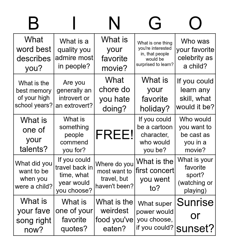 This bingo card has a free space and 24 words: If you could travel back in time, what year would you choose?, What is one of your favorite quotes?, What chore do you hate doing?, What is your fave song right now?, Who was your favorite celebrity as a child?, What word best describes you?, What is the best memory of your high school years?, What is a quality you admire most in people?, If you could be a cartoon character, who would you be?, Where do you most want to travel, but haven't been?, What is your favorite holiday?, What is one of your talents?, What is the first concert you went to?, What is your favorite sport?(watching or playing), Are you generally an introvert or an extrovert?, What super power would you choose, if you could?, Who would you want to be cast as you in a movie?, What is your favorite movie?, If you could learn any skill, what would it be?, What is something people commend you for?, Sunrise or sunset?, What did you want to be when you were a child?, What is one thing you're interested in, that people would be surprised to learn? and What is the weirdest food you've eaten?.