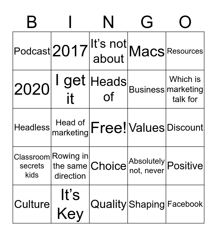 This bingo card has a free space and 62 words: It’s funny that, It’s Key, Clap, Classroom secrets kids, So, Neghead, I get it, Tan, Business, Zoho, Macs, What can you do, 2020, Revenue, Social media, Podcast, Facebook, Resources, Life work balance, Heads of, Values, It’s not about, Culture, Shaping, Tuesday, So I’m thinking, Awards, Town hall dental, Positive, When Ed had holiday, Hattie, May, Miracle, Offer, Discount, 2017, 2018, Anchor, Head of marketing, Boat, Headless, A.I, Rowing in the same direction, Could do, Which is marketing talk for, Absolutely not, never, Carvery, Coffee, Discourse, Key stage, Choice, Quality, Balance, LVCs, GPS, Interactive games, Vision, Maths, Dining room table, Investors in people, Besa and Floaters.